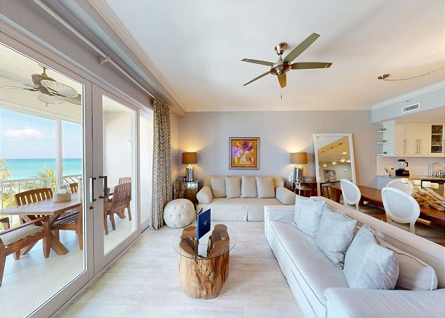 The living area comes furnished with plush sofa seating, plus an entertainment center with a television and audio system. Enjoy all the comforts of home, plus oceanfront views throughout the living area.