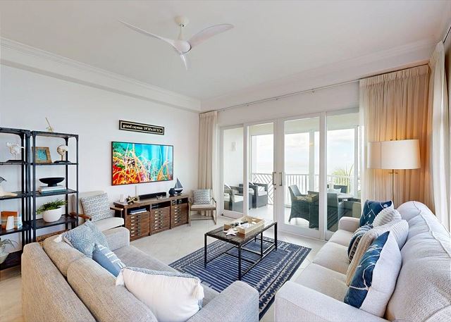The living area comes furnished with plush sofa seating, plus an entertainment center with high-definition television, Blu-Ray player, and home audio system. Enjoy all the comforts of home with oceanfront views throughout the living area.