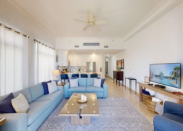 Inside, the interiors feature elevated ceilings, cool tiled floors, and modern fixtures. Central air conditioning, complimentary high-speed wifi, and satellite television programming will keep you cool and connected throughout your stay.